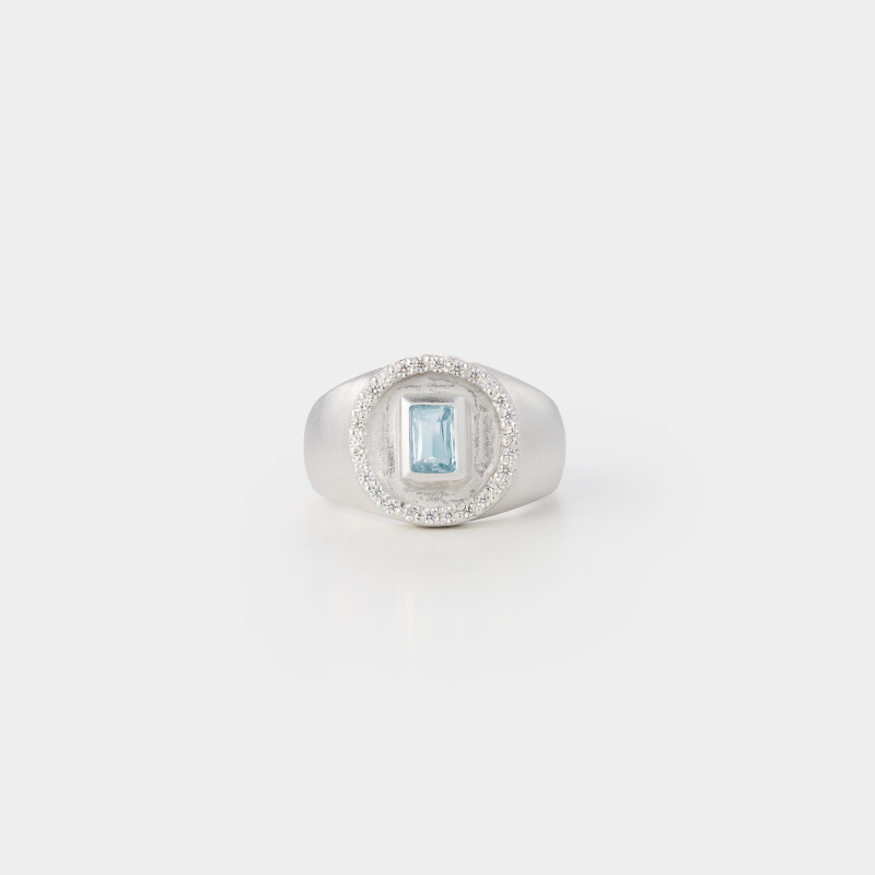 Réalisée à la main, la chevalière DIDI est en argent 925, sertie d’une aigue-marine et pavée de zircons.