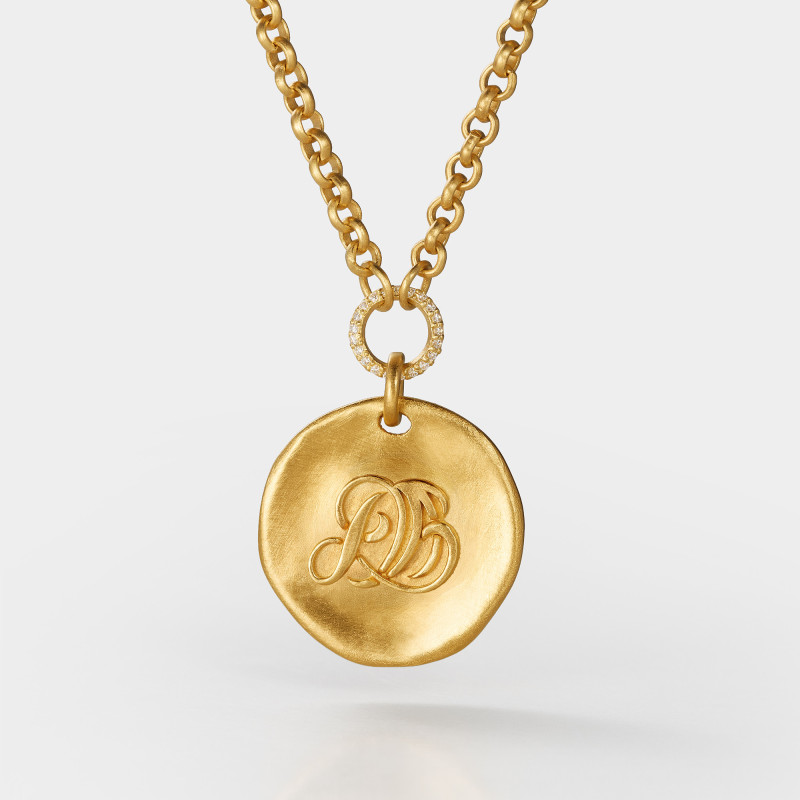 Réalisé à la main, le collier IDA révèle une médaille aux lignes irrégulières qui porte en son centre le monogramme d’Irene d’Arloz.