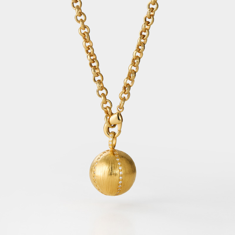 Réalisé à la main, le collier DUNK s’amuse des codes de la bijouterie traditionnelle avec sa forme de ballon de basket, dont les lignes sont pavées de zircons.